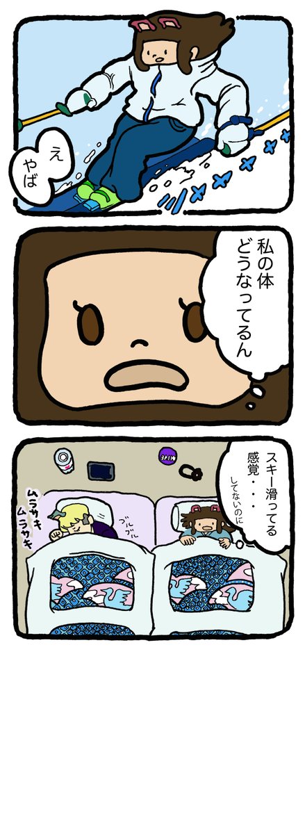 猫ミミ!猫背の?ネコ・ゼコちゃん☆』 〜3コマがちょうどいいマンガ〜 NO.078 【慣れない場所で寝るとこれです】 #漫画が読めるハッシュタグ #マンガが読めるハッシュタグ #猫背女子 #旅行あるある #スキー
