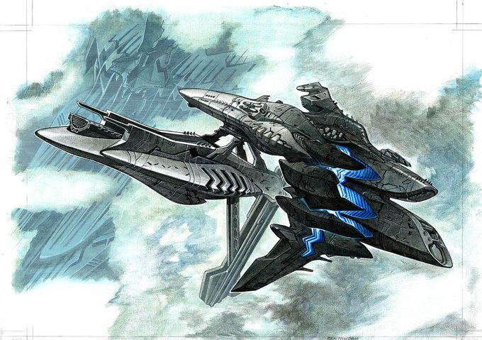 #既掲でもいいのでとにかく宇宙戦艦を貼ろう もうちょい続きます。戦艦と空母どちらを多く描いただろうか?宇宙戦艦といえばアニメ「スターシップ・オペレータズ」がテクスチャの無いソリッドなCGモデルを使っていて表面のディティールなど省かれていたけど、あれはどういう演出意図だったのだろう?