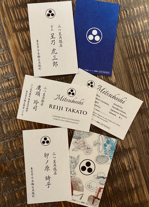 3人それぞれのキャラクターに合わせたデザインで嬉しいです✨ 虎は当主なのでシンプルで、時子は自分でコラージュした感じ。鷹頭は外国との取引もあるので英文付きとのことでした🐯🐰🦅 #日に流れて橋に行く