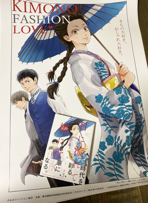 #きものファッション東京👘のポスターにイラストを使っていただきました。 サンプル届いたんですけど大きくてびっくりした…(単行本サイズと比較) 呉服屋さん他、きもの関係のお店などで見かけましたらよろしくお願いします。 #日に流れて橋に行く