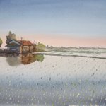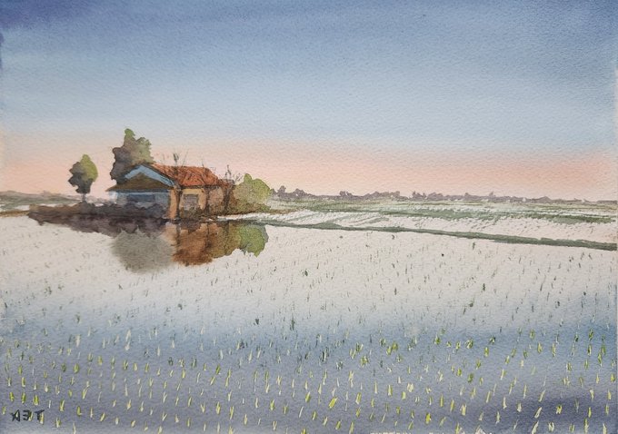 house on the rice paddies 水田の家 #日めくり水彩画 #watercolour #watercolorpainting #watercolourpainting #水彩画 #透明水彩 #顔彩 #風景画