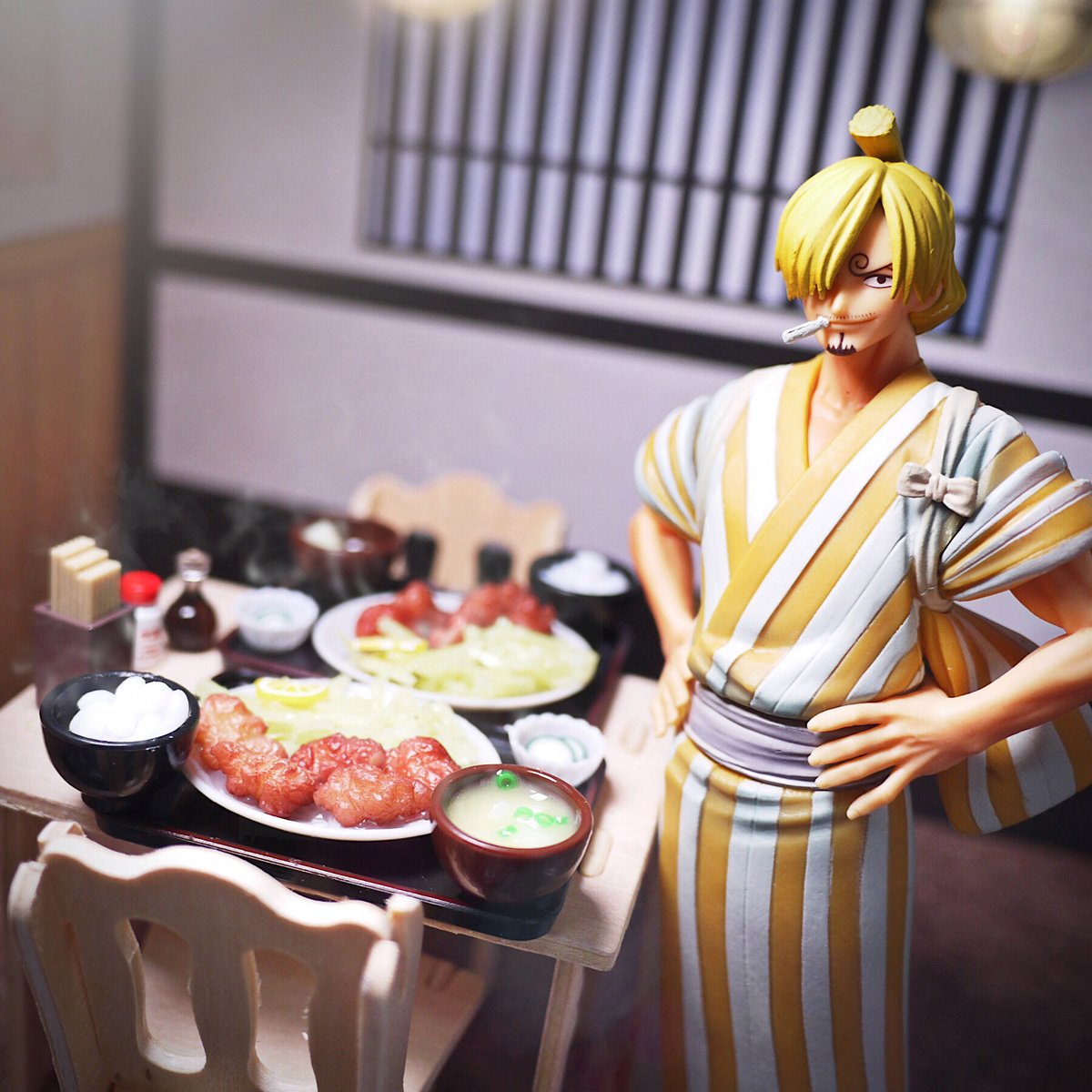 #夜のフィギュア撮影会 5/30 お題『フリー』 ゲットしたけど撮ってなかったトイズスピリッツのガチャガチャ二種・定食マスコット2とキャンプ飯マスコットを撮ってみた! #onepiece #sanji #サンジ #日替わり定食マスコット #ざキャンプ飯マスコット #トイズスピリッツ #ガチャガチャ #カプセルトイ