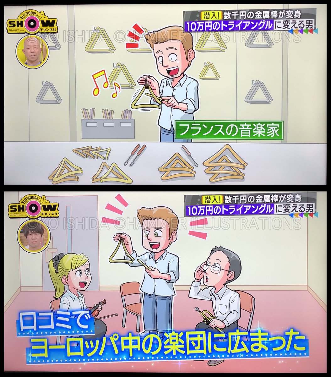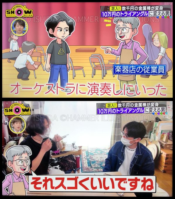 【最近の仕事】日本テレビ『1億3000万人のSHOWチャンネル』(2022年5月21日放送) 世界中のオーケストラから注文が殺到するトライアングルを制作する打楽器奏者の北山靖議さん。 北山トライアングルのエピソード用イラストを描きました。 #イラスト #日本テレビ #SHOWチャンネル #北山トライアングル