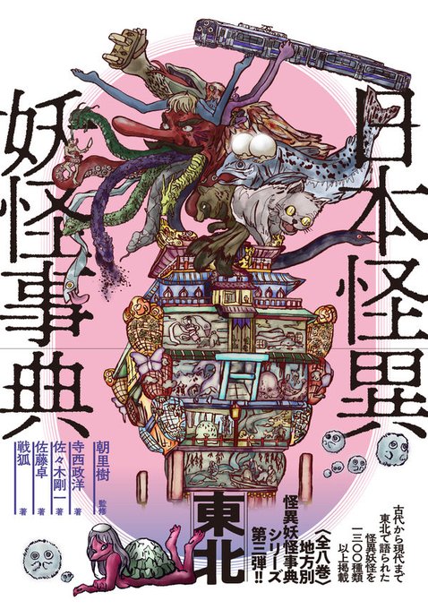 この表紙だけで 20体の妖怪を描きました。大蛇堂として「印象や雰囲気優先の原文と乖離する表現はしたくない」ためそれぞれの妖怪の情報を見せていただいて各々の要素を盛り込みまくりました。 足元の天空の不夜城にも仕掛けを施しております。さらに裏表紙にもまだいます。 #日本怪異妖怪事典東北
