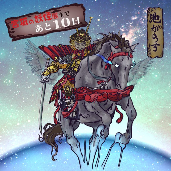 【池がらす】 宮城県本吉郡に伝わる。池のそばの林に棲むカラスと牝馬の間に生まれたという名馬。空を飛び魚のように水中を泳いだという。源頼朝に献上され戦場で活躍し重宝されたが、主人の頼朝が亡くなると故郷に戻り最期を迎えた。#宮城の妖怪展弍 #日本怪異妖怪事典東北