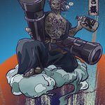 今日描いた絵。三吉様。 大平山の山神。善良な性格で酒と煙草と相撲が大好きで「サンキチ」と名乗る人間に化けて人里へ遊びに出かけるとも言われる。戊辰戦争の際に戦地に大砲を抱えて雲に乗った三吉様が現れ幕府軍と戦う秋田藩を援護射撃したという。#日本怪異妖怪事典東北 より。