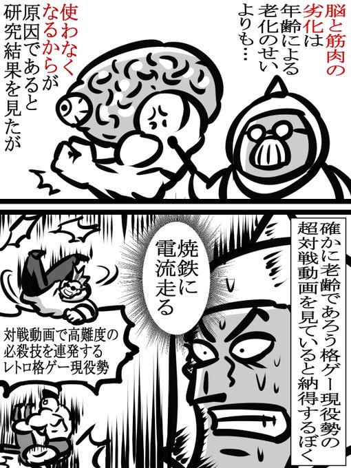 脳と筋肉が弱くなるのは加齢よりも「使わなくなるから」という研究結果を見て そういやレトロ格ゲー現役勢って高齢なはずなのに超プレイしてるなあと納得したぼく #日記漫画 #格ゲーキャラ描こうぜ