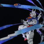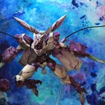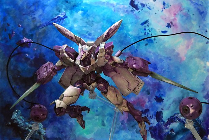 #日5ガンプラコンペ #水星の魔女 ベギルベウ 箱絵再現塗装 幻想的で綺麗な水星の魔女キットの箱絵をお手本として 自分なりの筆塗り表現で再現しました。 本体と背景紙をアクリルガッシュで筆塗りして 付属支柱とアクションベース6で浮かしています。