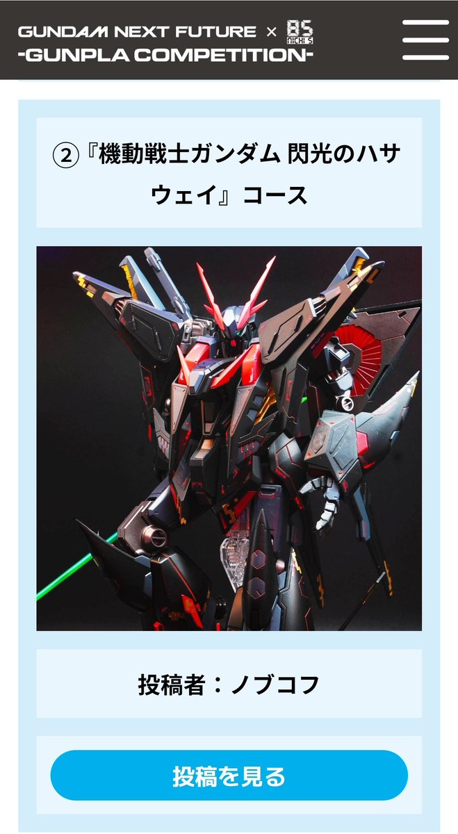「GUNDAM NEXT FUTURE ×日5ガンプラコンペ」の機動戦士ガンダム閃光のハサウェイコースで受賞しました!! やったーヾ(*´∀`*)ノ公式サイトのコンペ受賞マジで嬉しいです!! 見て下さった方ありがとうございます!! #日5ガンプラコンペ twitter.com/nobukofu0096/s…