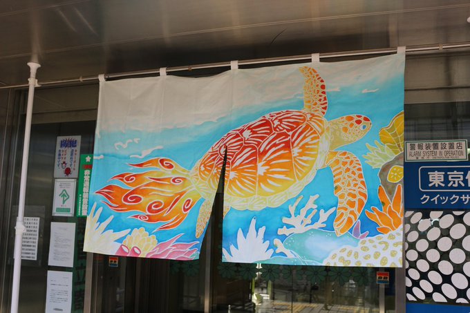 暖簾VOL4 これは銀行に展示した暖簾です 繁栄の象徴である亀をデザインした暖簾です。 毎年2月末に【染の小道】というイベントで展示しています。 #専門学校 #デザイン #ファッション #テキスタイル #染織 #イラスト #絵師 #オープンキャンパス #早稲田国際ビジネスカレッジ #絵描きさんと繋がりたい