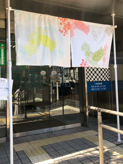 暖簾VOL16 学生が制作した暖簾で街中が華やかになります。 これは銀行に展示した暖簾です。 金運の象徴である金魚をデザインした暖簾です。 #専門学校 #デザイン #ファッション #テキスタイル #染織 #イラスト #絵師 #オープンキャンパス #早稲田国際ビジネスカレッジ #絵描きさんと繋がりたい