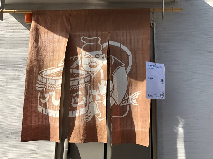 暖簾VOL19 学生が制作した暖簾で街中が華やかになります。 これは醬油屋さんに展示した暖簾です。 醤油色に商売の神様をプリントしました。 #専門学校 #デザイン #ファッション #テキスタイル #染織 #イラスト #絵師 #オープンキャンパス #早稲田国際ビジネスカレッジ #絵師さんと繋がりたい