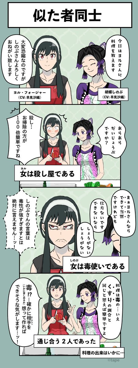4コママンガ「似たもの同士」 SPY×FAMILYのヨルさん&鬼滅の刃しのぶさんが料理を作ります。 CV:早見沙織さんで脳内再生してね。 #早見沙織 #漫画が読めるハッシュタグ #4コママンガ #4コマ漫画 #鬼滅の刃 #スパイファミリー #ヨル・フォージャー #胡蝶しのぶ #SPYFAMILY