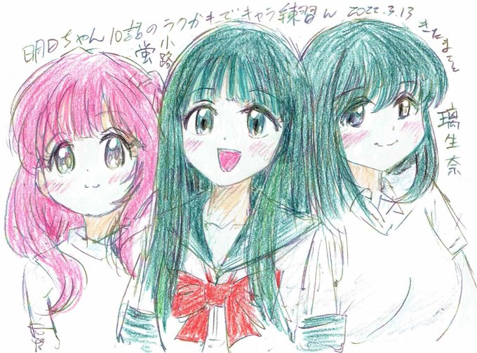 #みなさん去年の今頃はどんな絵描いてましたか おはようございます。去年の今頃は #明日ちゃんのセーラー服 10話のラクガキでキャラ練習絵を。今日の通勤は事故で迂回中ですが、むしろいつもより早く着きそう。では仕事に行ってきます! #明日ちゃん
