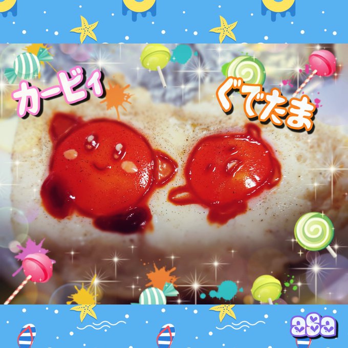 おは🌞 #毎日ケチャップアート 今日は目玉焼きの黄身を活かして、ぐでたまとカービィ💕可愛くかけた気がする🍅🎨 雨が止んでまた暑くなる気配がする… 既にバテてるよ😭みんなも気をつけて💦 #元メイドによるケチャップアート #おはようVtubar #星のカービィ #星のカービィ30周年 #ぐでたま #イラスト