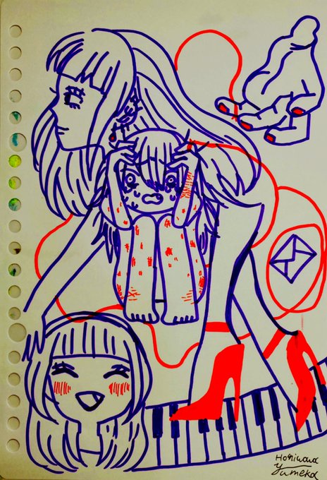 「痛いことばかりじゃない」 赤色が嫌いだった。血の色。殴られたり自分を傷つけると見る色だから。でも大人になって赤いハイヒールで歩いてみた。背筋が伸びて気持ちが明るくなった。そして絆の色だとも気づけた。今まで嫌ってごめんね。もう私は大丈夫。 #星ヲ輪ユメカのドローイング
