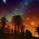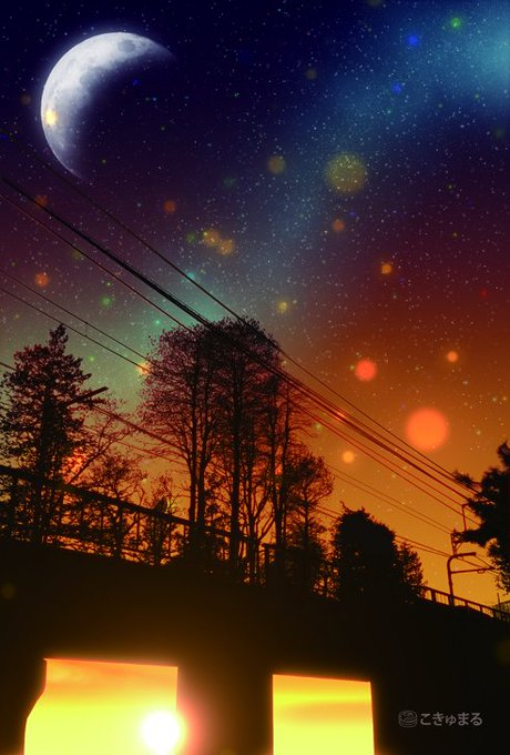 秋深し、秋の夕暮れと星空。 #イラスト #ファンタジー #ノスタルジー #星空 #星景 #電柱 #鉄塔 #デジタルアート #illustration #digitalart #photograghy