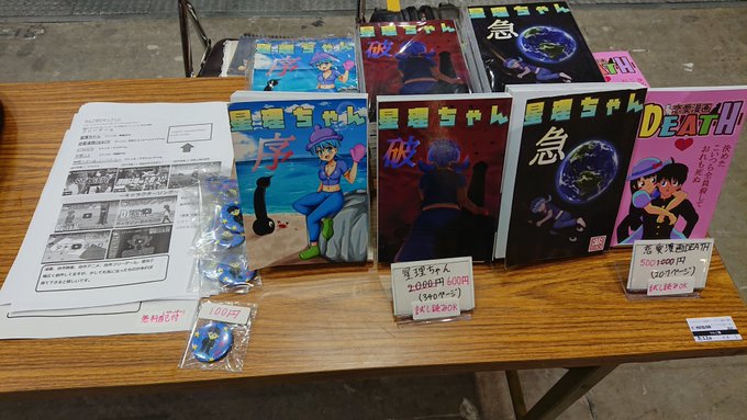 自席からはこんなかんじです ペーパーは無料配布ですので お取りくださいませ! 恋愛漫画DEATH一巻 わりと部数残り少ないのか #設営完了 #コミティア #コミティア139 #COMITIA139 #COMITIA #恋愛漫画DEATH #星理ちゃん #ペーパー #缶バッジ #創作クラスタさんと繋がりたい