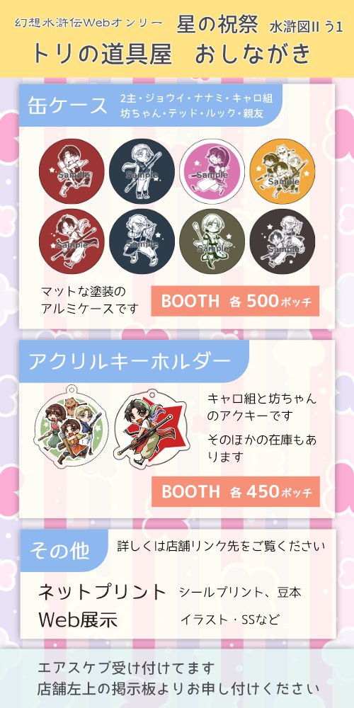 お品書きができました! 缶ケース+アクキーと、過去に出してたグッズなど置いています😆 ネットプリントでは豆本とシールを用意しました。(サンプルはツリーへ) 展示もいくつか置く予定ですのでそっと覗いでください😊 エアスケブもやる予定です🖋 #星祝祭0505_参加 #星祝祭0505_お品書き