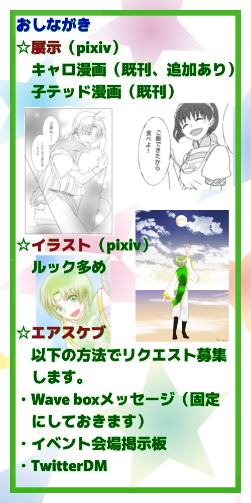 #星祝祭3 #星祝祭3_お品書き おしながき更新しました。 エアスケブ募集しています。 展示はpixivです。 よろしくお願いします。 twitter.com/Elkidou_love/s…