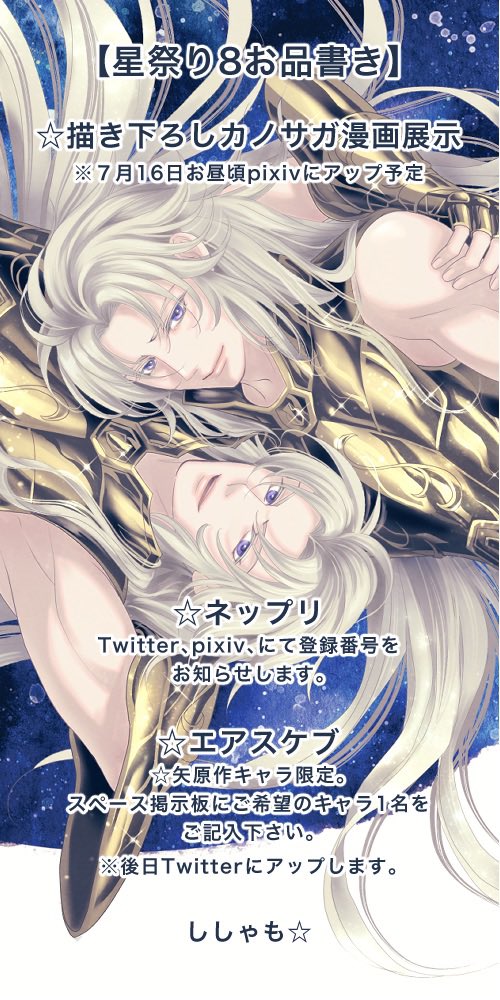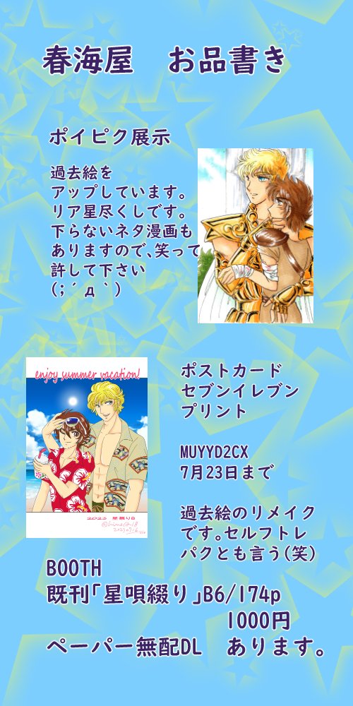 遅ればせながらやっとこさお品書き出来ました!本日はどうぞよろしくお願いいたします。 ポイピク poipiku.com/MyIllustListPc… ポスカ(セブンイレブン) MUYYD2CX 7月23日まで BOOTH harumiya-tatsuta.booth.pm #星祭り8 #星祭り8展示 #星祭り8頒布