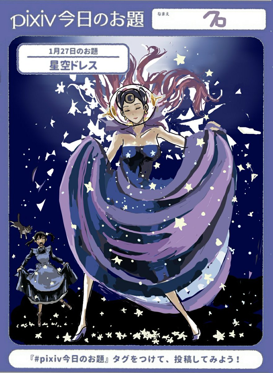 「 #星空ドレス 」素敵なお題ですね~. もしまだ描き込み出来たらFANBOXとかなんかに上げときます. #イラスト #絵 #Art #Illustration #wip... sketch.pixiv.net/items/54267610…