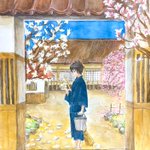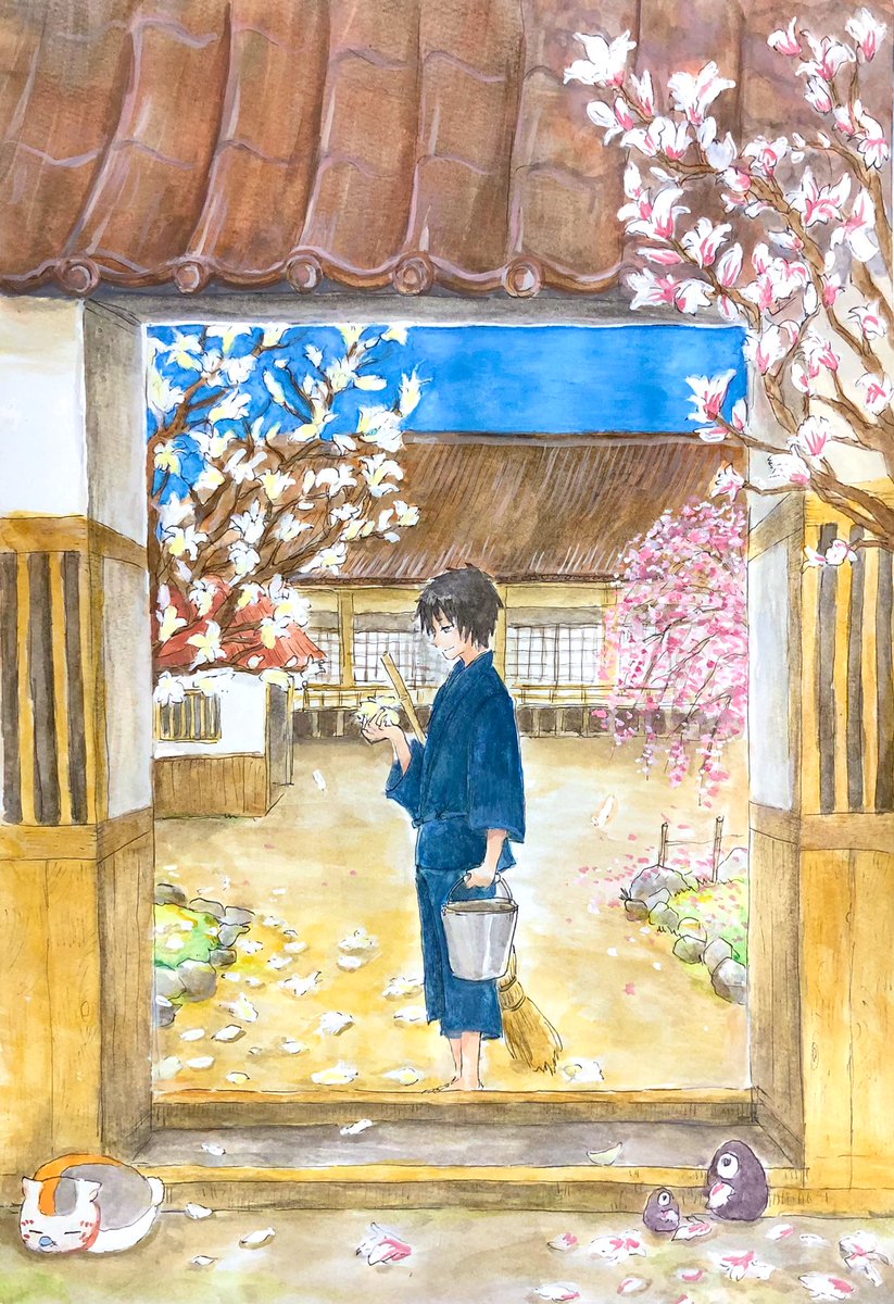 すいません一部塗り直しして再アップしました💦 寺の境内の掃除してたら花のまま落ちてるモクレンの花が綺麗で勿体ないなと思った田沼くんが、花を集めて花手水を作りました、という設定の絵です。 #春のたぬまつり2022