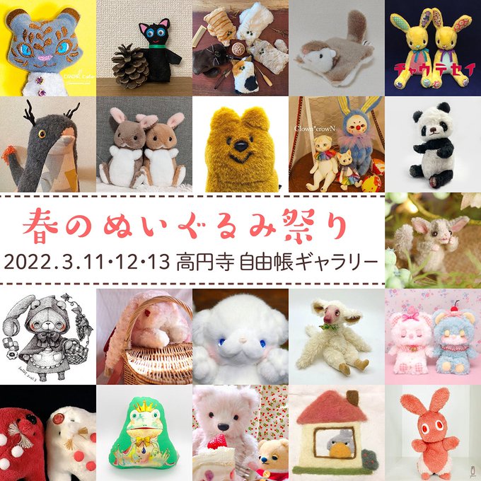 🧸春のぬいぐるみ祭り🧸 スーパー最高な作家さまたちが集まってくださり、念願のぬいぐるみ祭りを主催させていただける事になりました! 高円寺の自由帳ギャラリーにて、大集結します!最高の空間になることまちがいなし、楽しみです😇 詳しくはこちら chau.chu.jp/ngm.html #春のぬいぐるみ祭り