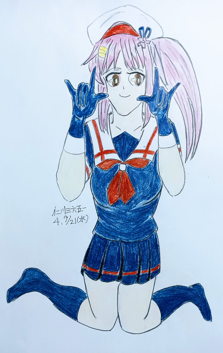 司令官に「愛してる」とハンドサインを送る春雨ちゃん #艦これ版深夜の真剣お絵描き60分一本勝負 #艦これ版真剣お絵描き60分一本勝負_20220921 #艦これ #春雨 #春雨生誕祭 #春雨生誕祭2022 #色鉛筆