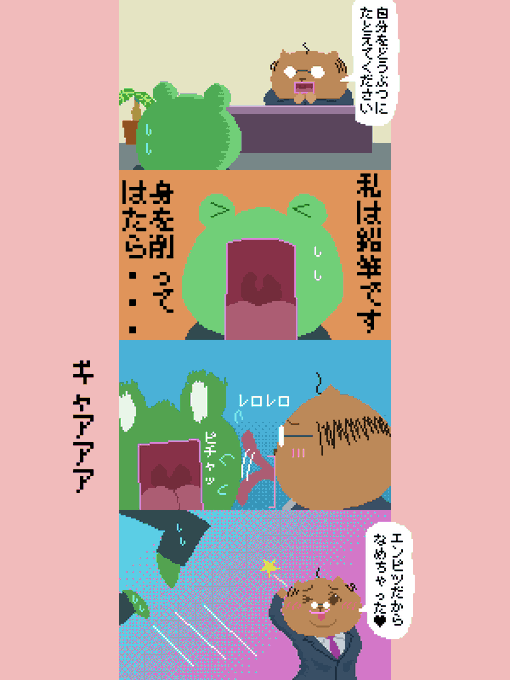 ドット絵 4コマ漫画 ぴくせるラッコ 「自分を物に例えてください」 #漫画が読めるハッシュタグ #ゆるいイラスト #ゆるかわ #pixelart #PixelManga #みんなで楽しむTwitter展覧会 #昭和あるある #昭和レトロ