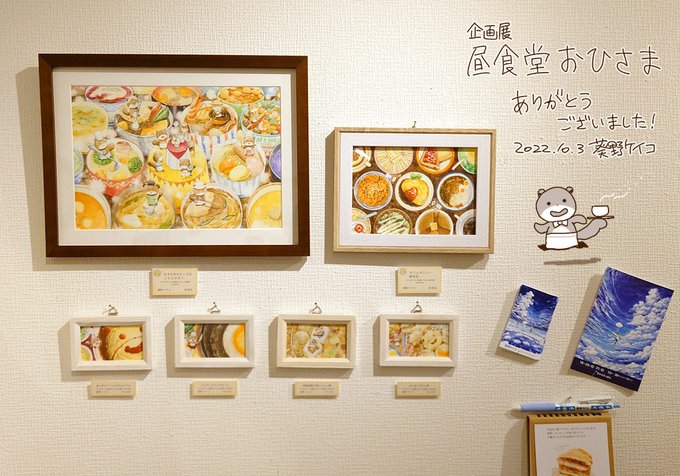 『昼食堂 おひさま』展示作品です☺️ 残り2日ぜひ作品を見ていただきたいです🐱✨ 作品詳細ページはこちら👇 gallery-ato.jimdofree.com昼食堂-おひさま/ #もちお絵 #昼食堂おひさま #イラスト twitter.com/satuki_mimi/st…