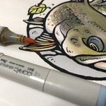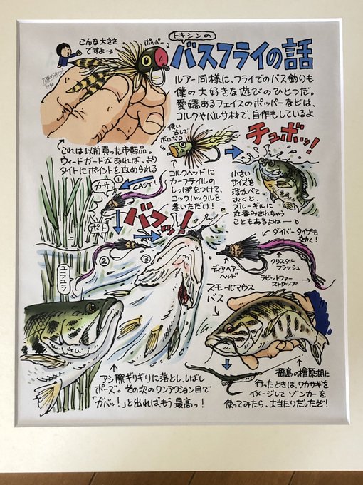 2004年の個展用に描いたプライベート作品。 これもコピックで着色しています。 左上のポッパーはその後西表島でチヌを釣ったらボロボロに噛み砕かれ針だけになりました。 #コピック #copic #バス釣り #フライフィッシング #bassfishing #fishingart #flyfishing #釣り #イラスト #時川真一 #トキシン