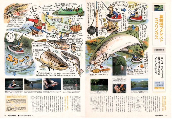 フライロッダーズ(2003)より。 フロートチューブのトラウトフィッシングって最高に面白いですよね。 また伺いたい釣り場😊 ※ペン画の線画にコピックで着彩 #フライフィッシング #トラウト #裏磐梯フォレストスプリングス #イラストルポ #トキシン #時川真一 #fishingart #コピック #copic