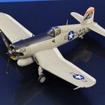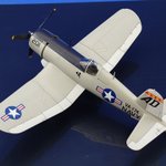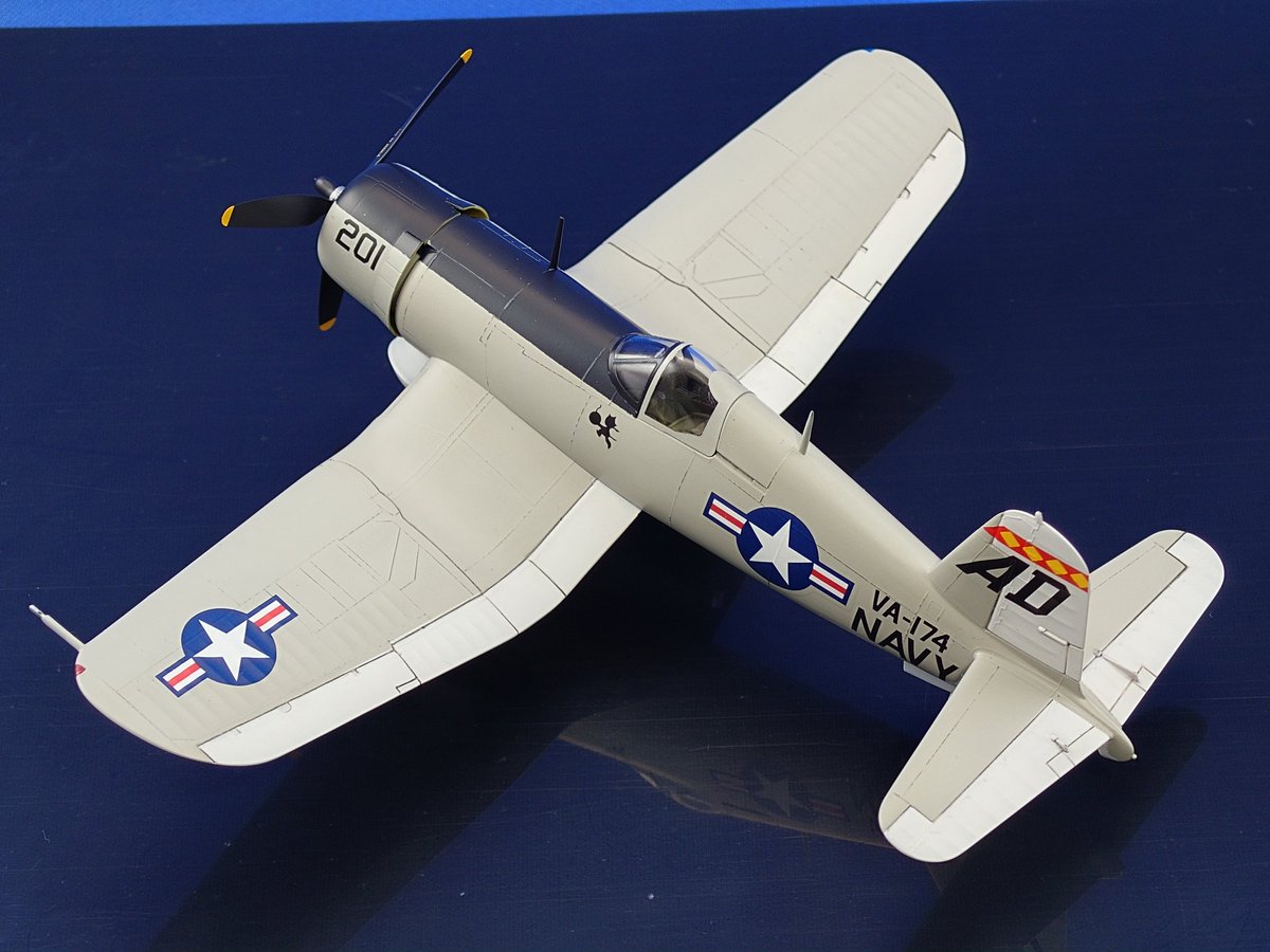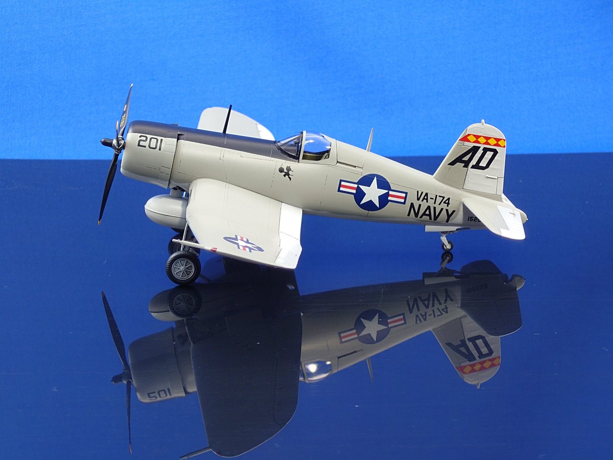 コルセア、ロールアウトしました! \( 'ω')/ヘーイ ワンデイモデリングでオトシマエ完了。ガルグレイ塗装のAU-1をモチーフにした架空塗装です。皆、シーブルーばかりなので傾いてみました。一風変わって良い感じかと。今回も主催および見てくださった皆さまに感謝を。 #晩秋のコルセア祭り完成