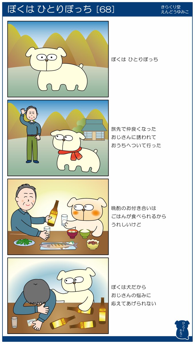 ロンリーわんこ🐶の4コマ漫画「ぼくはひとりぼっち」68話です #4コマ漫画 #4コマ #漫画が読めるハッシュタグ #イラスト #イラスト好きな人と繋がりたい #犬 #ロンリーわんこ #ぼくはひとりぼっち #ぼくひと #きらくり堂 #晩酌