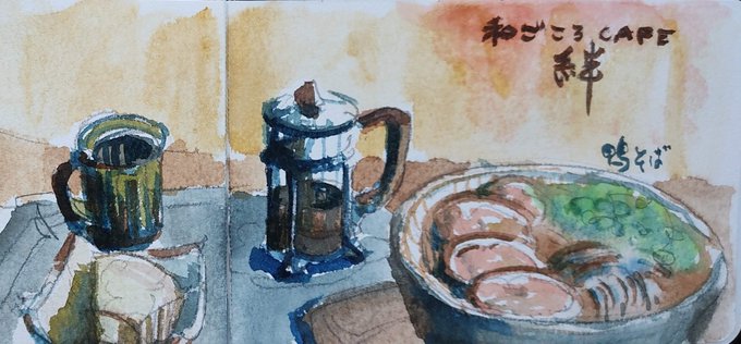 #暖かくなるような画像貼った人が優勝 スケッチブック見てたら、これは温かいだろうというのがありました。 冬の自転車ツーリング。思い出の一杯です。このお店は宮ヶ瀬湖というところにあります。寒かった😆 #水彩画 #watercolor