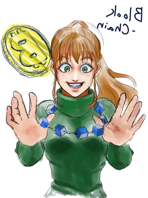 ブロックチェーン 反転したまま仕上げしたの投稿してから気付きました。とりあえずまぁいいか。 ビットちゃん(仮)のネックレスはブロックをチェーンで繋いでます。 #illustration #イラスト #仮想通貨 #暗号資産 #擬人化 #ビットコイン #ブロックチェーン #BTC #Blockchain #bitcoin #Cryptocurency