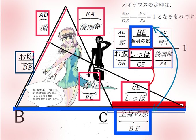 #冬の創作クラスタフォロー祭り #みんなで楽しむTwitter展覧会 #一次創作 #イラスト王国 #アトリエの系譜S #ArtistOnTwitter #創作同盟 #暗記法 #勉強垢 #数A #メネラウス #Menelaus 影と、しっぽの分母分子が逆になっていました。エラそーに「間違わない」なんて描いたのが恥ずかしい。