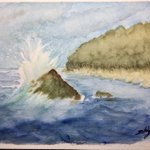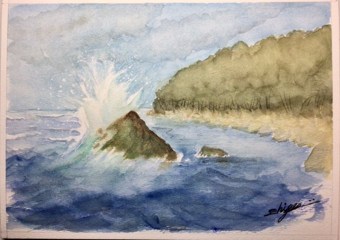 〜岩に砕ける波〜 今日も透明水彩絵の具を使って、岩に砕ける波を描いてみました。沖から寄せてきた波が、岩にあたって激しく砕けています。 #透明水彩画 #風景画 #曇り空 #海 #岩に砕ける波 #絵を描いている人と繋がりたい #絵が好きな人と繋がりたい