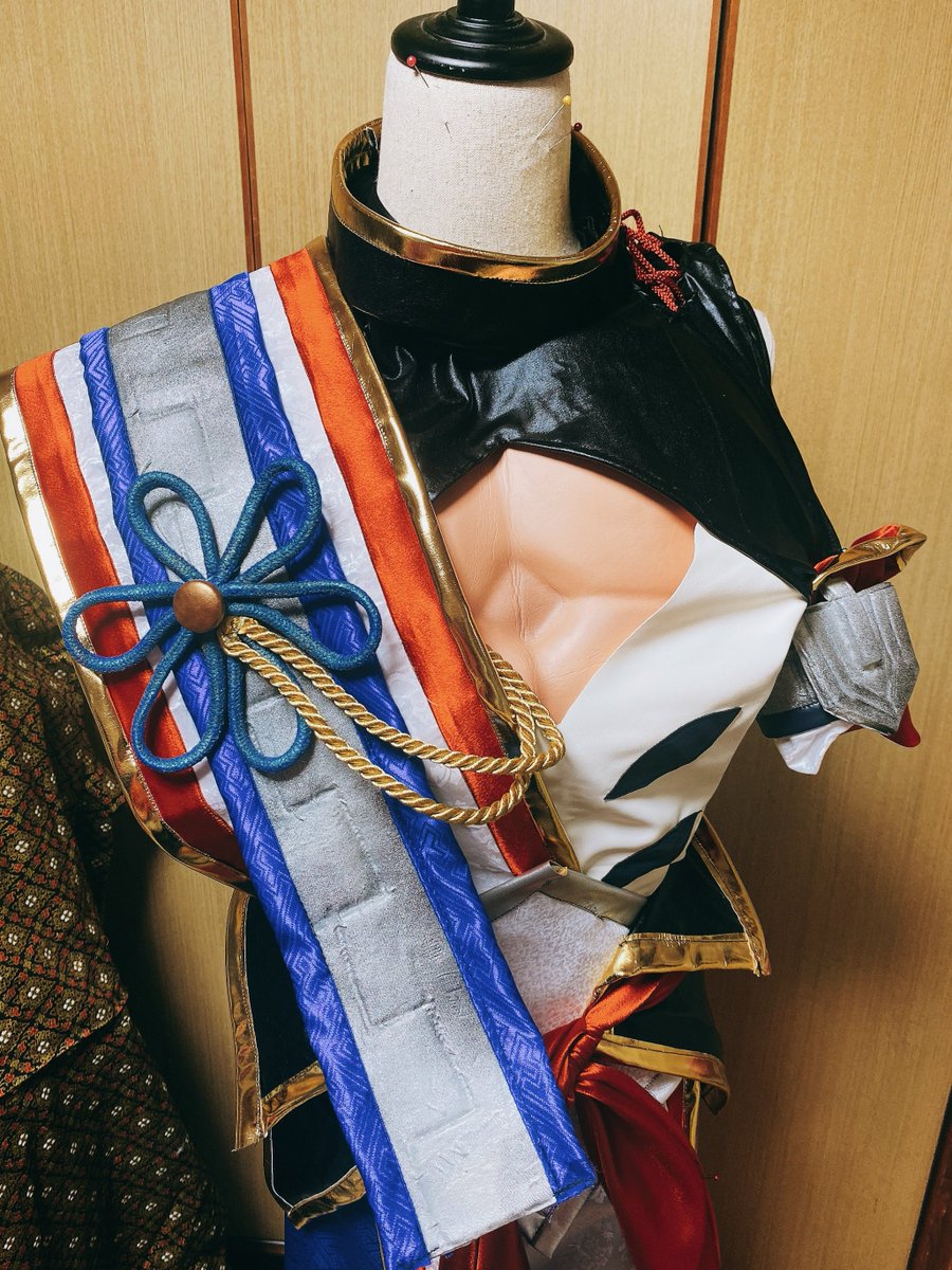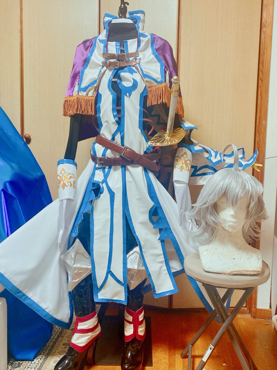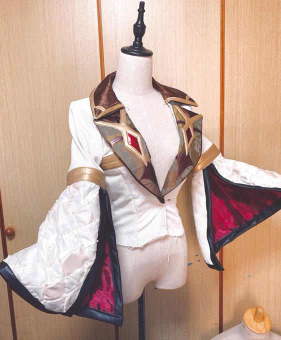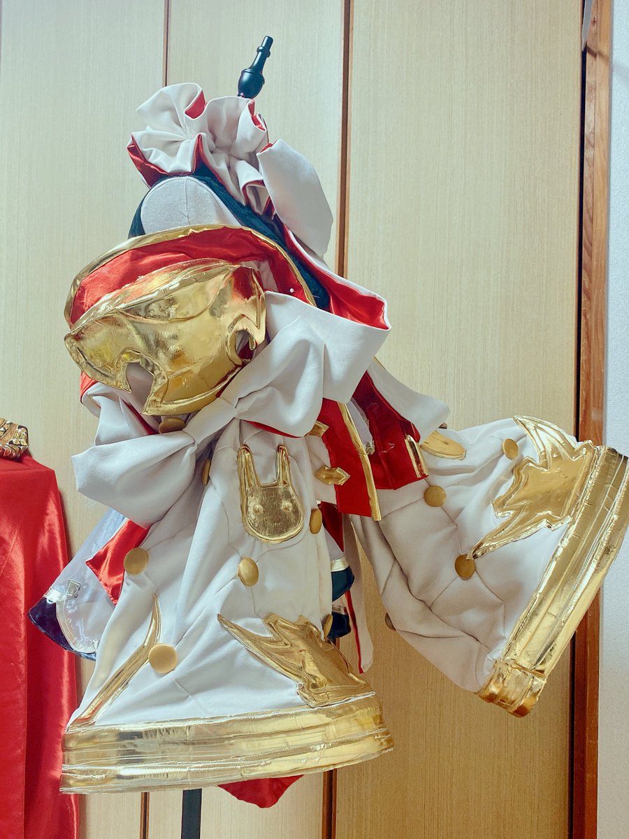 衣装できた!特仲はね2人並べて作ってあげないといけないと思ったので2人作りました!9章4節現在の資料でなのでふんわり見て欲しい…… 襟にワイヤー仕込んで立つようにしたり、肩の鎧が倒れないようにしたりなんか大変だったけど2つの衣装が並んでるのめちゃくちゃに良い #曲崎さん進捗いかがですか