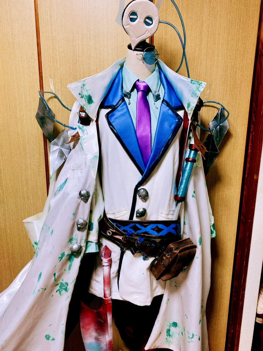 衣装できた!!メギド8魔星のバールベリトさんです✂︎カッコイイね!! コートのグラデーションと裾のシルエットすごい好き。シザーバッグと注射器ホルダーがカッコよく作れたのでお気に入りです💉 #曲崎さん進捗いかがですか