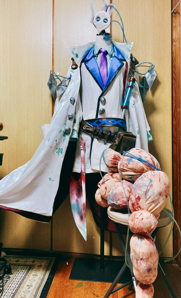 衣装完成しましたー!無期迷途のアイン先生〜!!!ベルトに医療器具つけてるのすごくカッコいいなと思ってたのでなんか頑張って実物っぽいのをなるべく固定してみました🩺 スタイリッシュですごくカッコいい…!!眼鏡キャラあまりやらないので着るの楽しみ…! #曲崎さん進捗いかがですか