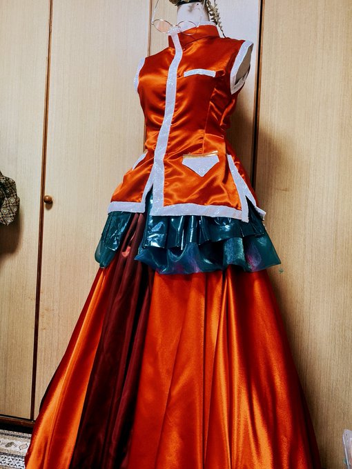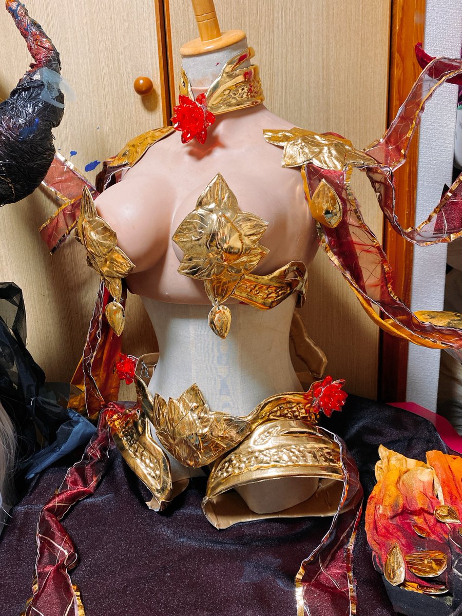 衣装できた〜🐍メギドのヴリトラさん〜!! ボディタイツがトルソーに着せれなくてあんまり上手く写真撮れてないので雰囲気だけど…すごく苦戦した…。ほぼ見えないけど脚の切り替えを全部縫ったりとか頑張りました💮 帯のお花が可愛くできた気がしてお気に入りです🌼 #曲崎さん進捗いかがですか