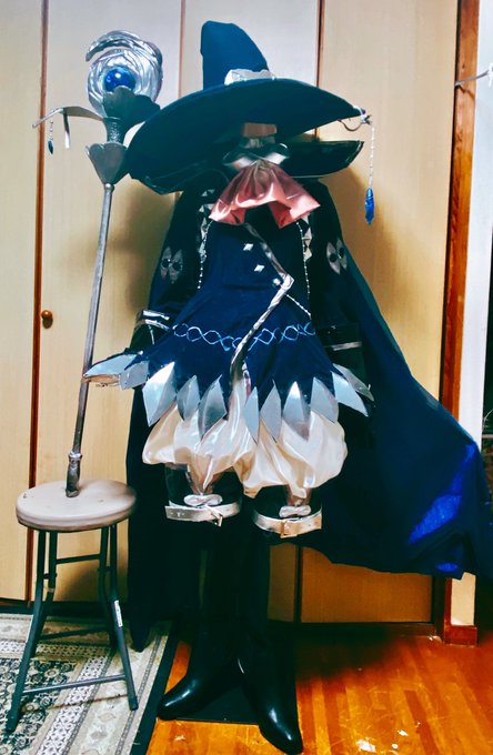 アクィエルのリジェネレイト衣装完成しました⚰今回はうっすら模様のあるゴシック感のある生地を選びました!キルティングも全部縫って装飾は手縫いでつけていきました〜! わかりにくいけど棺桶は背負えます〜!フック式にしてるのでベルトから外せるようになっています🌼 #曲崎さん進捗いかがですか