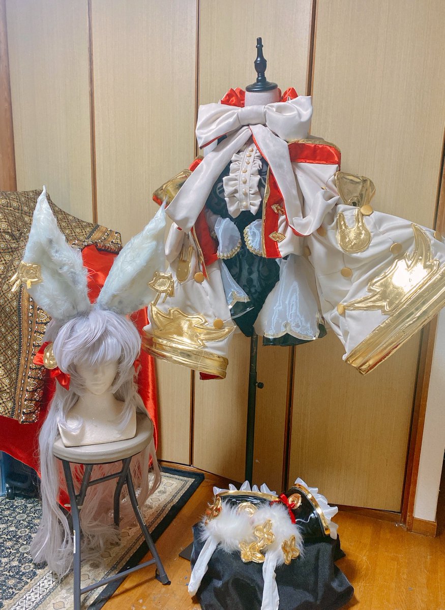 グラブルの十二神将マコラの衣装できました〜🐇!うさちゃんと🌙のモチーフがたくさんでとてもかわいい イベント用なので武器は今回なしです ボリュームたっぷりの袖だけど肩出しショートジャケットでカジュアルなのがかわいいな〜と思って作ってました #曲崎さん進捗いかがですか