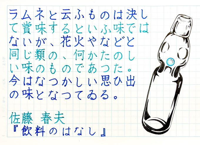 お題をありがとうございます #空想書写 No. 492 佐藤春夫「飲料のはなし」 ずっと描きたかったラムネのお題、やっと追いつきました! 私はヤクルトを炭酸水で割って飲むのが好きです。 #絵描きさんと繋がりたい #書写好きな人と繋がりたい #アナログ絵 #ラムネ瓶 twitter.com/img_shosha/sta…