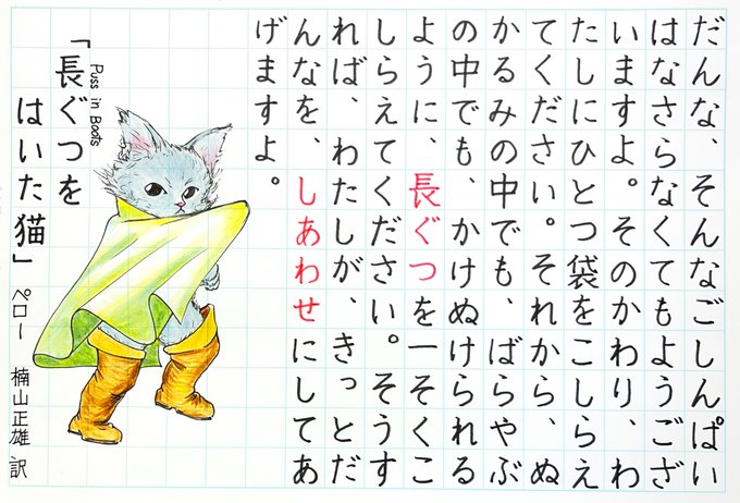 お題をありがとうございます。 #洋書de書写 第230回 『長靴をはいた猫』 一度は言われてみたいセリフですね。 挿絵のモデルは我が家のノンタンです。 #書写好きな人と繋がりたい #絵描きさんと繋がりたい (マントの色、赤にすればよかったかな) twitter.com/yousho_shosh…