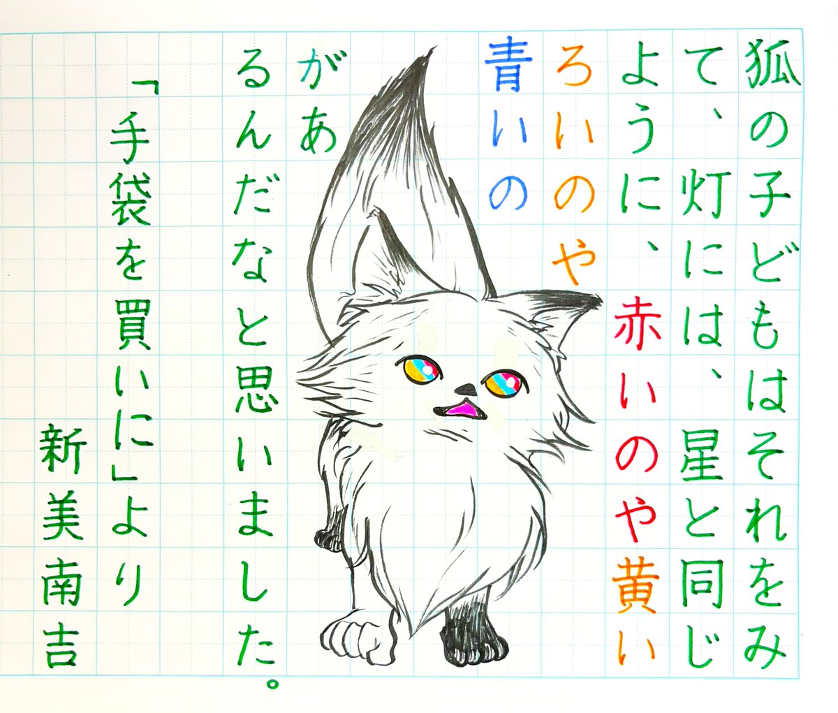 お題をありがとうございます。 #新美南吉書写 第21回「手袋を買いに」⑦ 赤や黄色や青い「灯り」はあえて描かず、子狐の瞳の反射のみで表現しようとしたら、ただの狐のドアップ絵になりました✨ #書写好きな人と繋がりたい #絵描きさんと繋がりたい #20分ドローイング twitter.com/aomidori02/s…