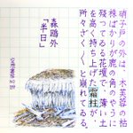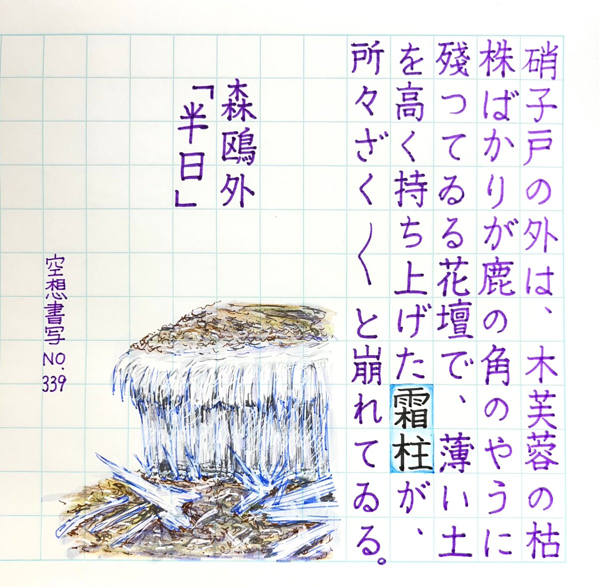 お題をありがとうございます。 #空想書写 No. 339 森鴎外「半日」より 霜柱が所々ざくざくと崩れいている様。 踏みてぇっと思ってくれたら嬉しいです。 #書写好きな人と繋がりたい #絵描きさんと繋がりたい #20分ドローイング twitter.com/img_shosha/s…