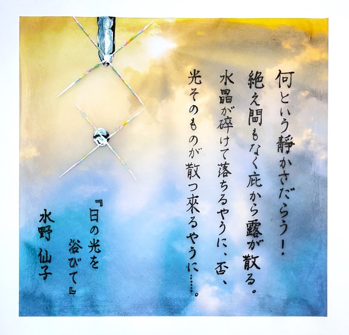 お題をありがとうございます。 #空想書写 No. 351 水野仙子 「日の光を浴びて」 つららとしずく、ラメのペンで表現。 背景は、いつものダイソー折り紙。 白い台紙に糊で貼ったら、つららの方の光線が歪んでしまった、悔し。 #書写好きな人と繋がりたい #絵描きさんと繋がりたい twitter.com/img_shosha/s…